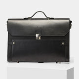 Handcrafted in Natural Dry Milled and Vegetable Tanned Leather, The Money Maker is an executive briefcase with a leather flap and nickel clasps for closure. It has a neat cotton lining on the inside along with 2 interior side pockets and a single zipper pocket. The back zip pocket converts it into an Add-a-Bag sleeve that easily fits onto your carry on luggage.