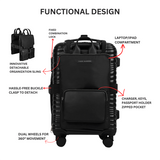 But what sets ELITE NOMAD apart is its innovative detachable organization sling – a revolutionary addition to the world of travel accessories. Adorning the bag like a bespoke vest, this sling offers easy-access storage on both sides, featuring a large zipped pocket, two smaller zipped pockets, and on the other side, an additional two large zipped pockets. Not only does this sling provide convenient storage for travel essentials, but it also doubles as a hand-held bag, allowing you to breeze through airport security with ease.